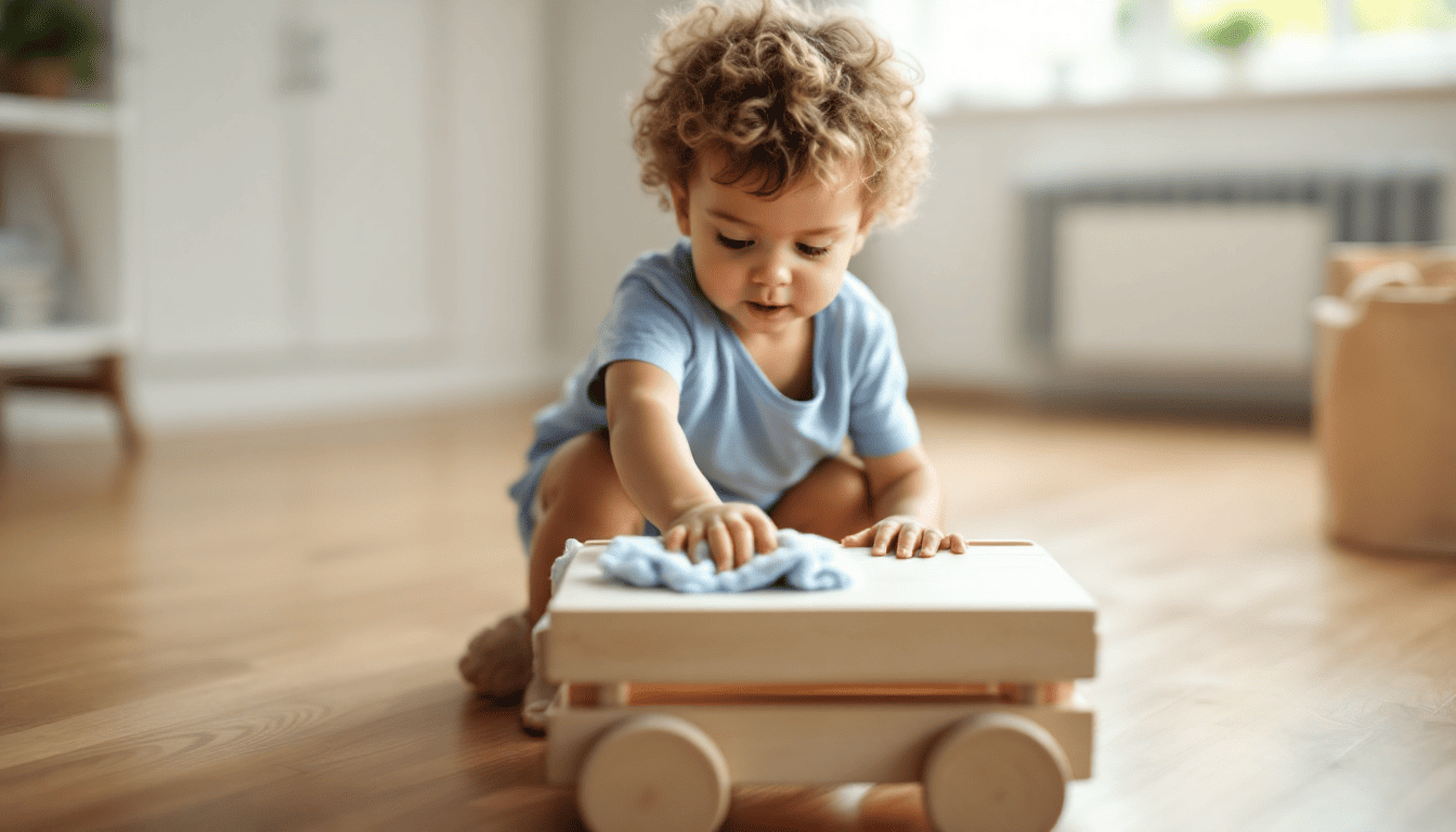 Para desinfetar, especialmente após uma doença ou se o brinquedo for compartilhado com outras crianças, use soluções naturais que não agridem a madeira nem a saúde do seu filho.