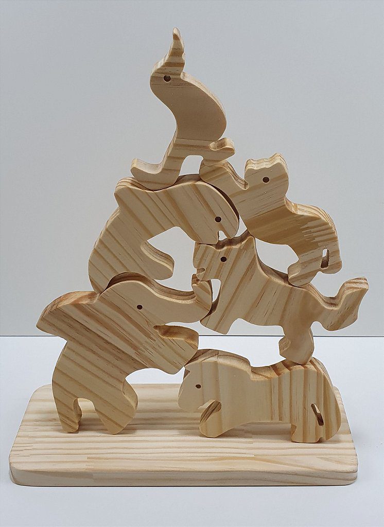 Quem consegue empilhar mais alto? O kit Animais Equilibristas é um jogo cativante que testa a paciência, a estratégia e a coordenação motora fina. Com 6 peças de madeira, a diversão é garantida, sozinho ou em grupo.