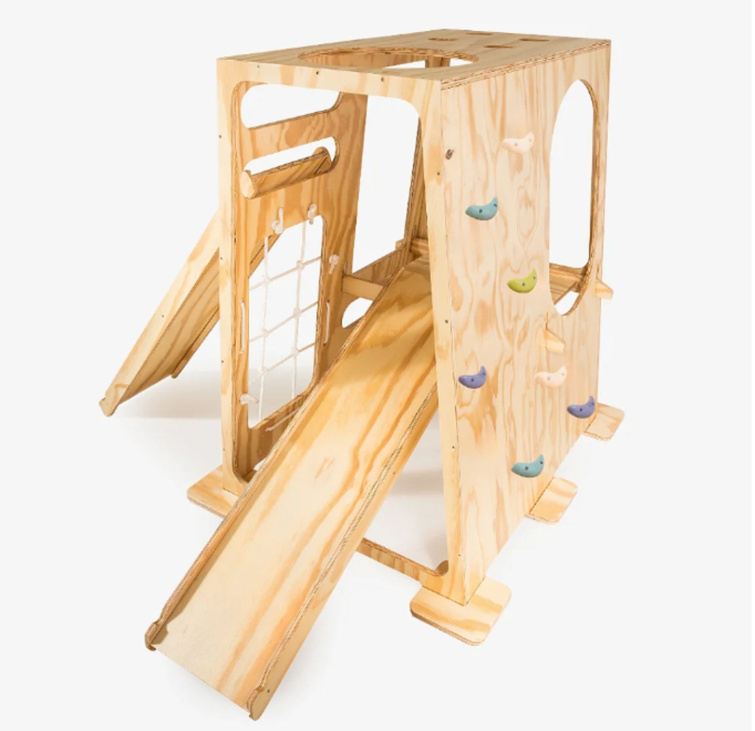 Playground dinâmico com rampas exclusivas que incentivam a escalar e deslizar, desenvolvendo equilíbrio e força em crianças de até 10 anos.
